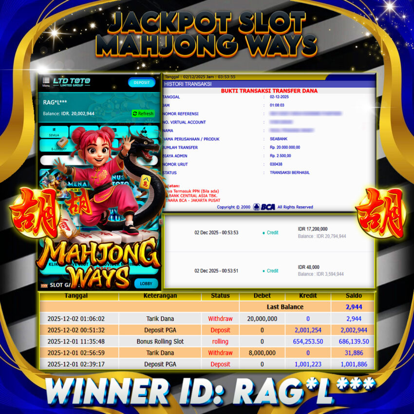 Selamat kepada User id : RAG*L*** Telah berhasil mendapatkan kemenangan besar pada permainan SLOT MAHJONG WAYS , kemenangan Sebesar Rp.20.000.000, Setelah mengisi formulir withdraw dengan kurang waktu hanya 5 – 10 menit pihak LTDTOTO sudah melakukan transfer kepada pemilik User id dan dana sudah dapat di cairkan oleh pemenang. Bukti pembayaran yang kami berikan merupakan bukti pembayaran yang SAH / VALID yang langung di dapatkan melaui tanda transfer transaksi dari Bank yang di tuju. Kami mengucapakan banyak Terima Kasih Kepada pemenang karena sudah mempercayakan kami sebagai Bandar Tepercaya yang membayar semua kemenangan member hingga lunas. Masih ragu dengan LTDTOTO bos ? Di mana bandar togel online sekarang yang terpercaya seperti LTDTOTO? Bandar yang mengirimkan kemenangan member tanpa bertele – tele. Jadi…. tidak perlu khwatir pada situs LTDTOTO karena kemenangan anda berapapun akan dibayarakan hingga lunas kepada pemenang.