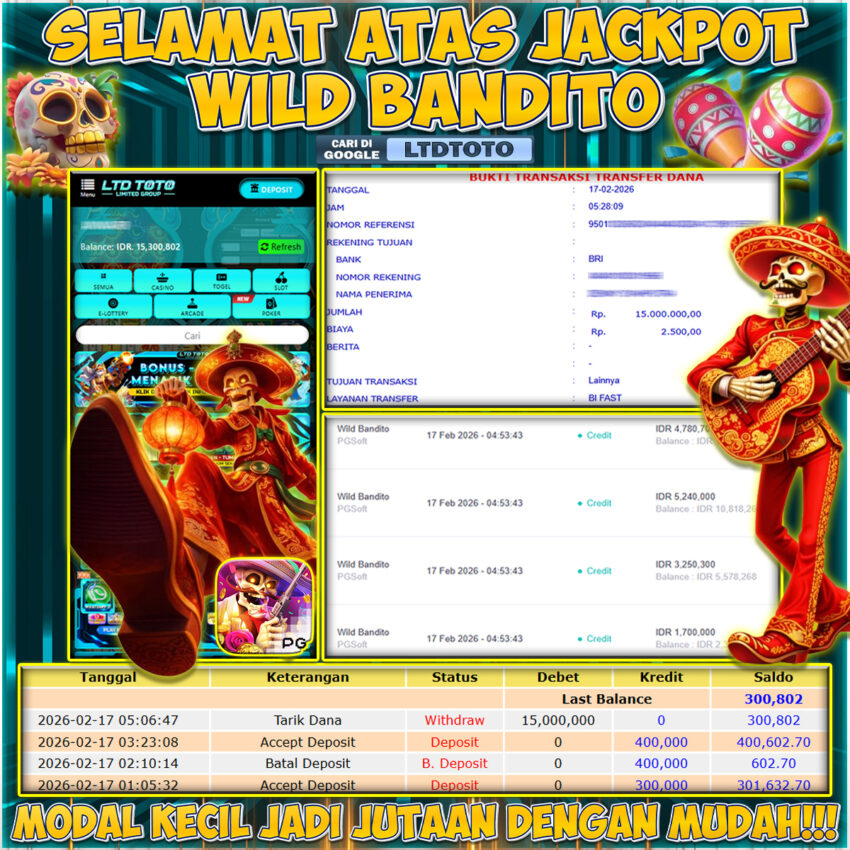 LTDTOTO JACKPOT WILD BANDITO RP 15.000.000 SELASA 17 FEBRUARY 2026